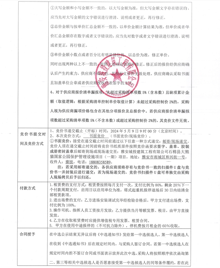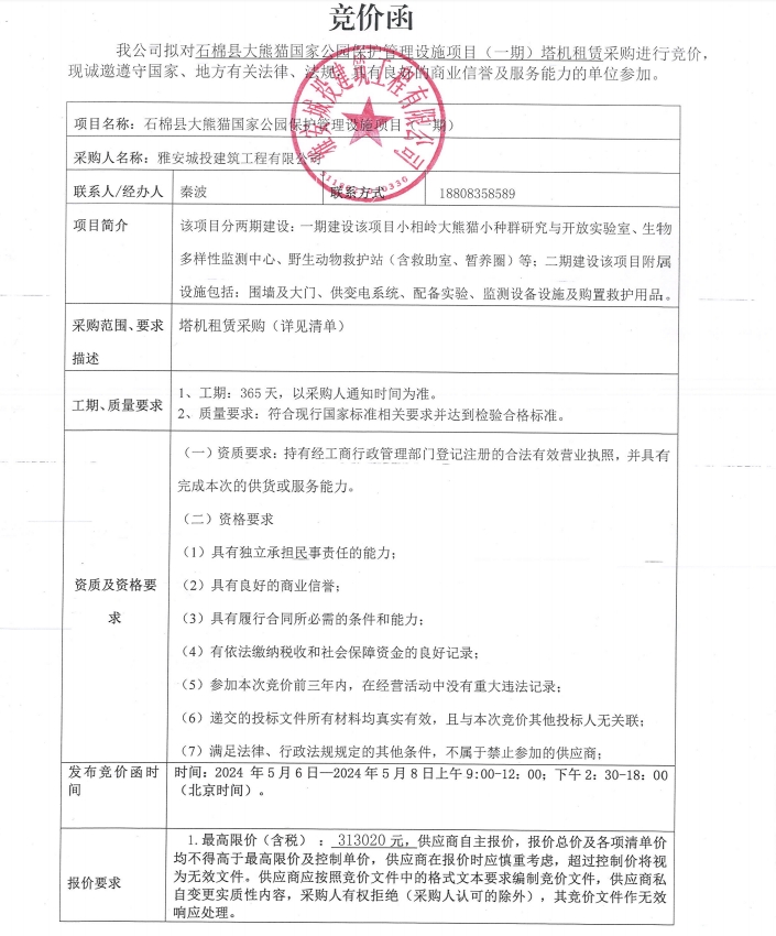 石棉縣大熊貓國家公園保護(hù)管理設(shè)施項(xiàng)目(一期)塔機(jī)租賃采購競價(jià)公告