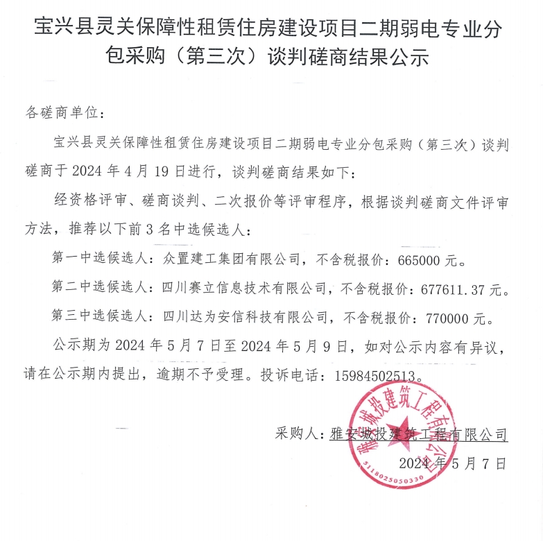 寶興縣靈關(guān)保障性租賃住房建設(shè)項目二期弱電專業(yè)分包采購(第三次)談判磋商結(jié)果公示
