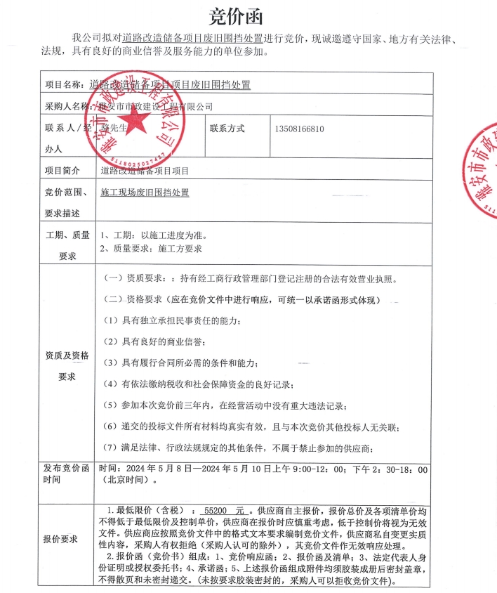 道路改造儲備項目廢舊圍擋處置競價公告