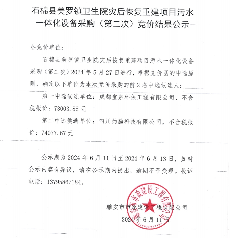石棉縣美羅鎮(zhèn)衛(wèi)生院災后恢復重建項目污水一體化設(shè)備材料采購(第二次)競價結(jié)果公示