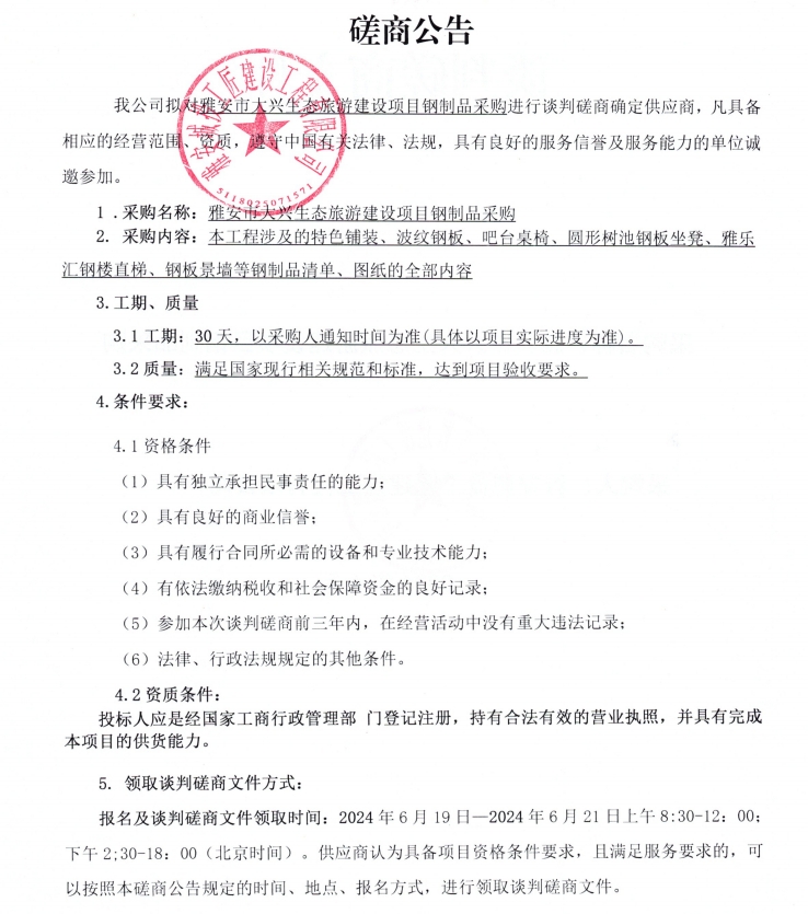 雅安市大興生態(tài)旅游建設項目鋼制品采購談判磋商公告