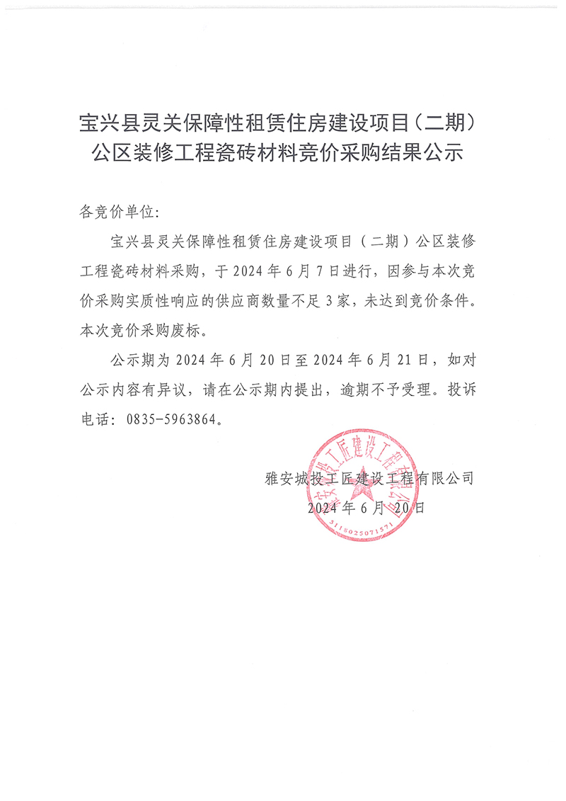 寶興縣靈關(guān)保障性租賃住房建設(shè)項(xiàng)目(二期)公區(qū)裝修工程瓷磚材料競價采購結(jié)果公示