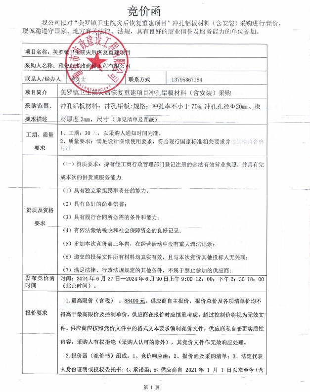 石棉縣美羅鎮(zhèn)衛(wèi)生院災(zāi)后恢復(fù)重建項(xiàng)目沖孔鋁板材料(含安裝)采購(gòu)競(jìng)價(jià)公告