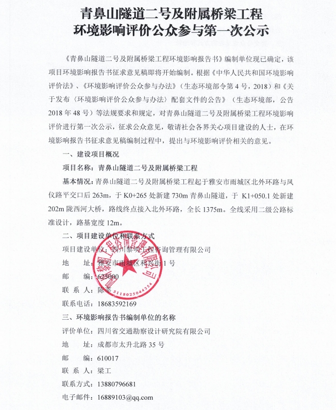 青鼻山隧道二號及附屬橋梁工程項(xiàng)目環(huán)境影響評價(jià)公眾參與第一次公示