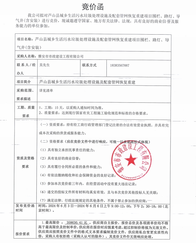 蘆山縣城鄉(xiāng)生活污水垃圾處理設(shè)施及配套管網(wǎng)恢復(fù)重建項(xiàng)目圍欄、路燈、導(dǎo)氣井(含安裝)采購(gòu)競(jìng)價(jià)公告