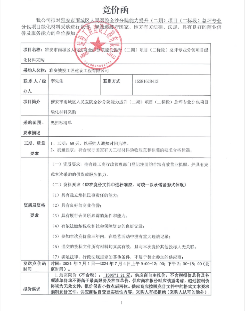 雅安市雨城區(qū)人民醫(yī)院金沙分院能力提升(二期)項目(二標段)總坪專業(yè)分包項目綠化材料采購競價公告