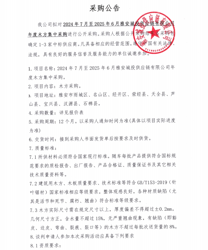 2024年7月至2025年6月雅安城投供應(yīng)鏈有限公司年度木方集中采購(gòu)公告