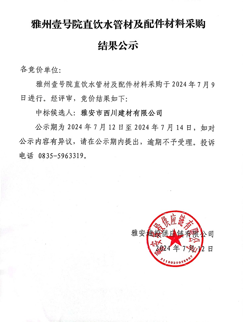 雅州壹號(hào)院直飲水管材及配件材料采購結(jié)果公示