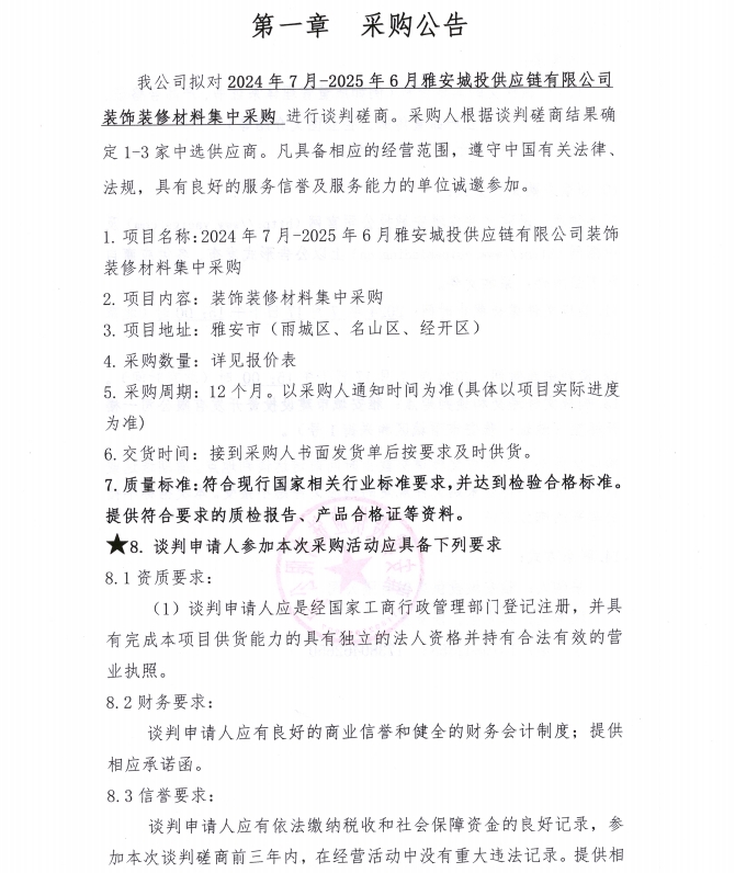 2024年7月-2025年6月雅安城投供應鏈有限公司裝飾裝修材料集中采購公告