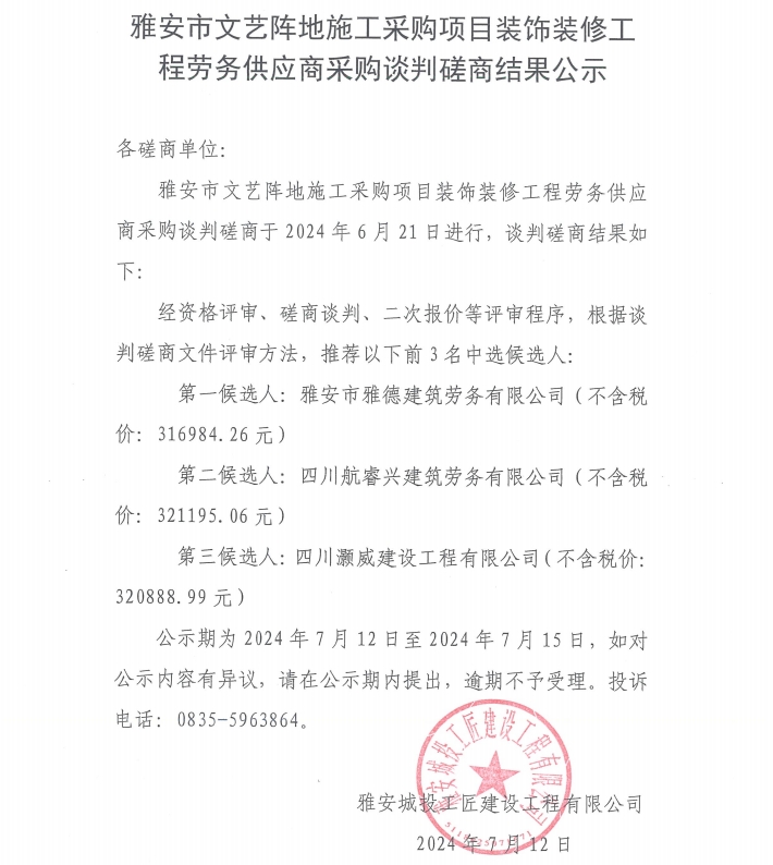 雅安市文藝陣地施工采購項目裝飾裝修工程勞務(wù)供應(yīng)商采購談判磋商結(jié)果公示