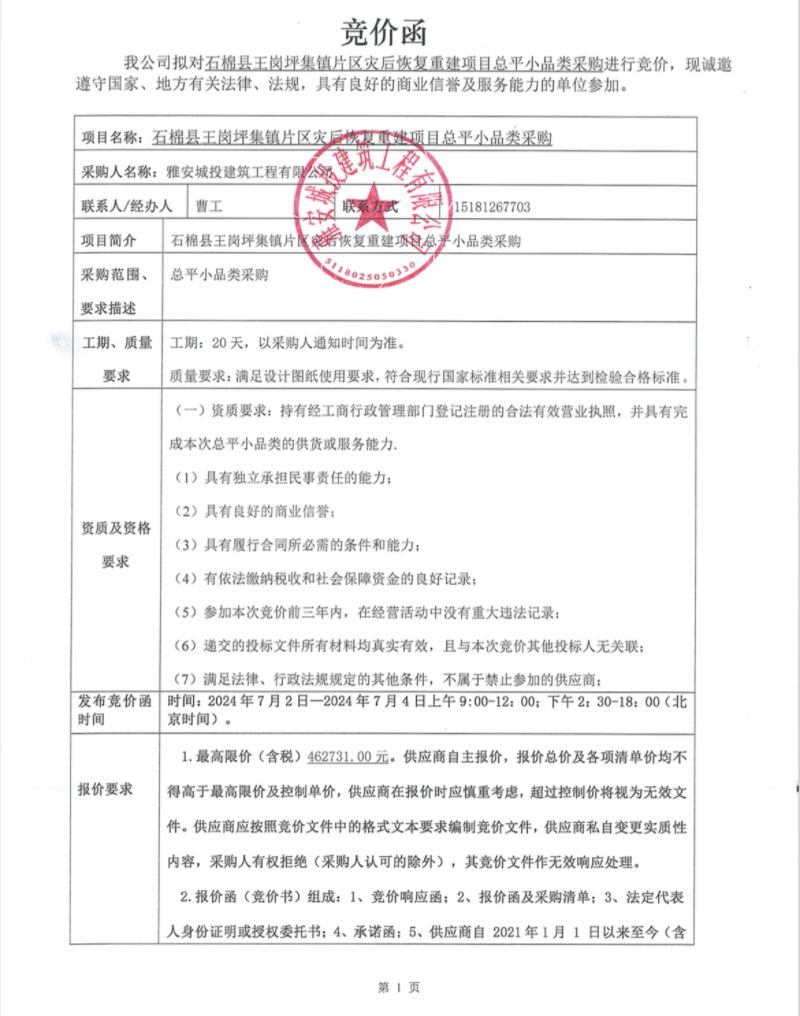 石棉縣王崗坪集鎮(zhèn)片區(qū)災(zāi)后恢復(fù)重建項目總平小品類采購競價公告