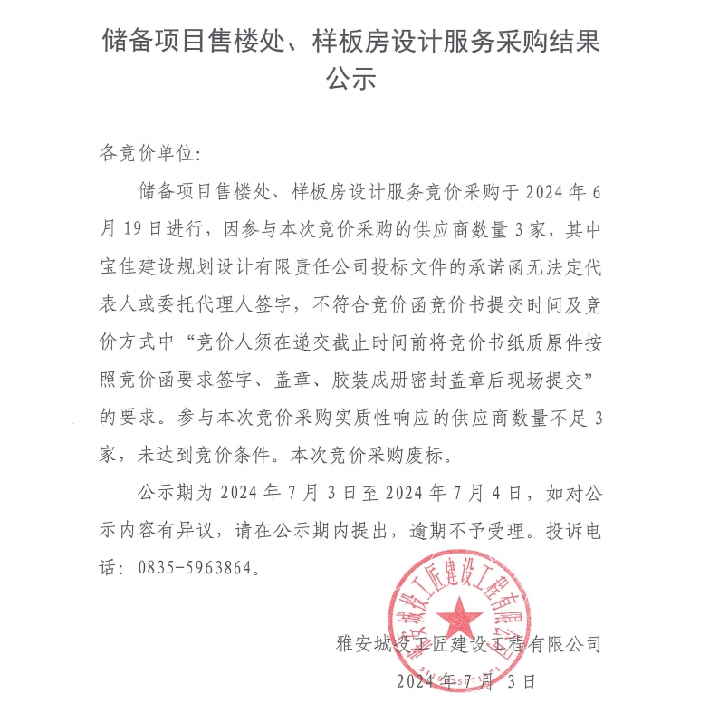 儲備項目售樓處、樣板房設計服務采購結果公示