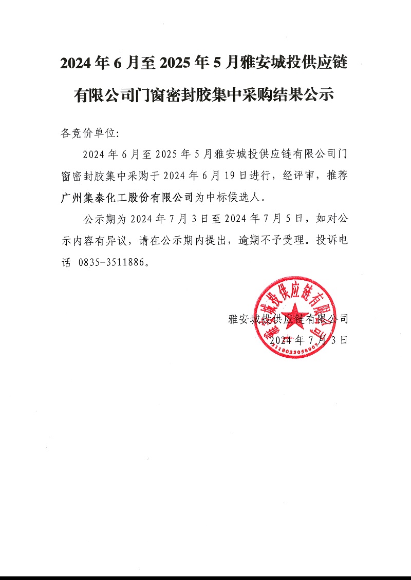 2024年6月至2025年5月雅安城投供應(yīng)鏈有限公司門窗密封膠集中采購(gòu)結(jié)果公示