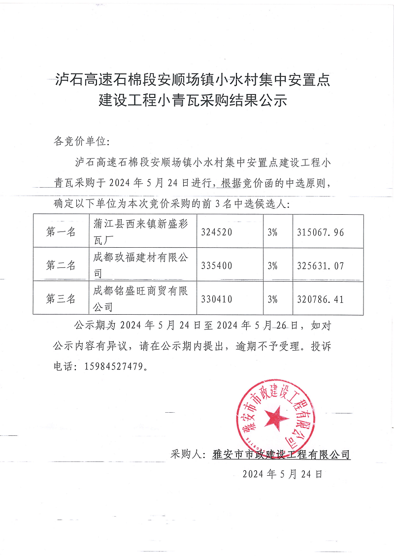 瀘石高速石棉縣段安順場鎮(zhèn)小水村集中安置點建設(shè)工程小青瓦采購結(jié)果公示
