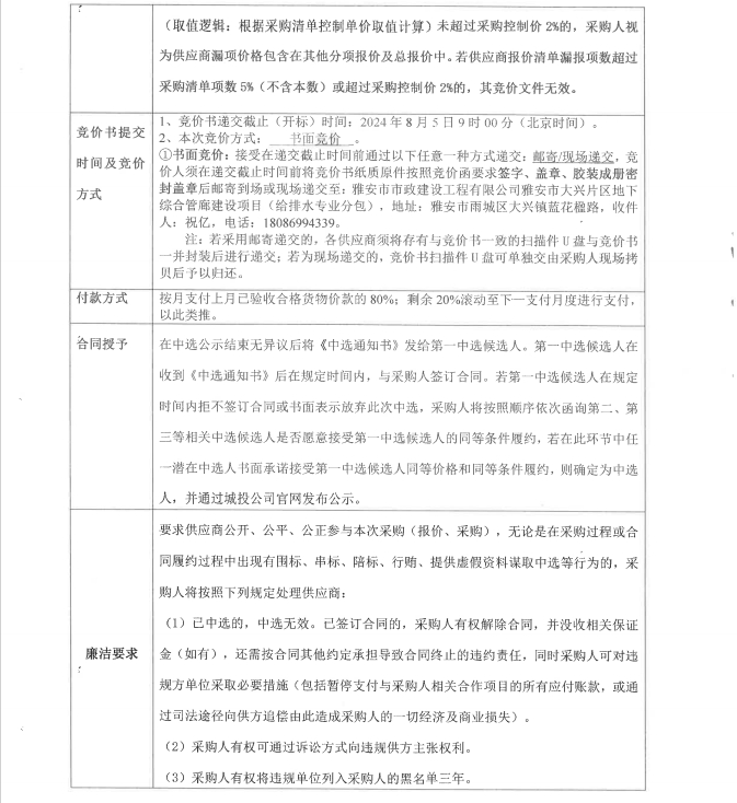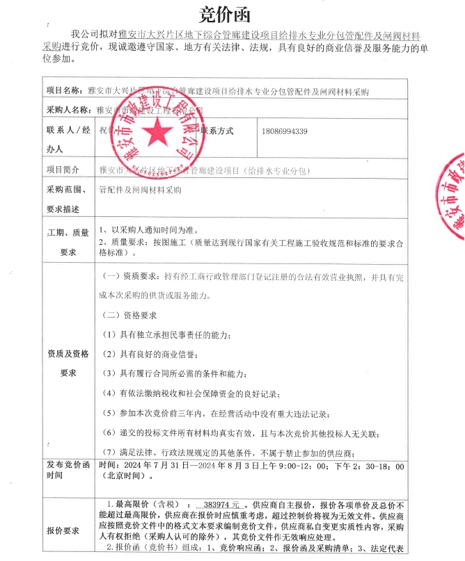 雅安市大興片區(qū)地下綜合管廊建設(shè)項目給排水專業(yè)分包管配件及閘閥材料采購競價公告