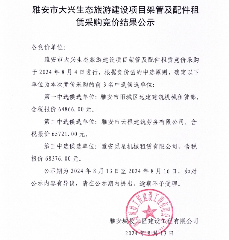 雅安市大興生態(tài)旅游建設項目架管及配件租賃采購競價結果公示