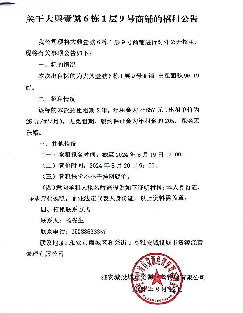 關(guān)于大興壹號6棟1層9號商鋪的招租公告