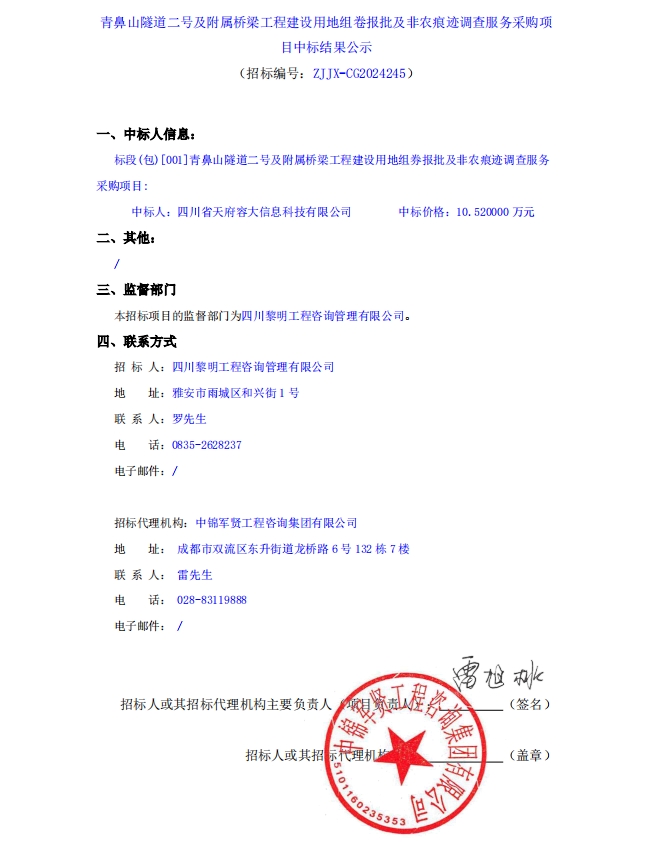 青鼻山隧道二號(hào)及附屬橋梁工程建設(shè)用地組卷報(bào)批及非農(nóng)痕跡調(diào)查服務(wù)采購項(xiàng)目中標(biāo)結(jié)果公示