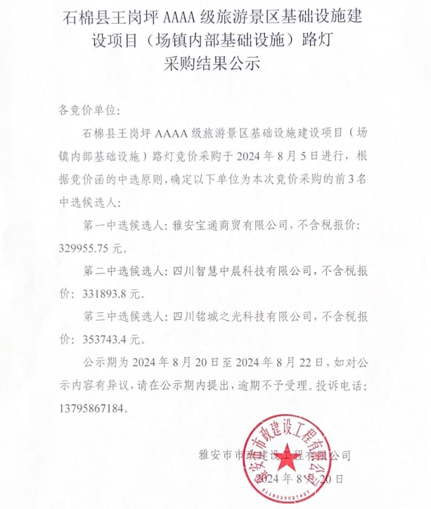 石棉縣王崗坪鄉(xiāng)AAAA級旅游景區(qū)基礎(chǔ)設(shè)施建設(shè)項目(場鎮(zhèn)內(nèi)部基礎(chǔ)設(shè)施)路燈采購結(jié)果公示
