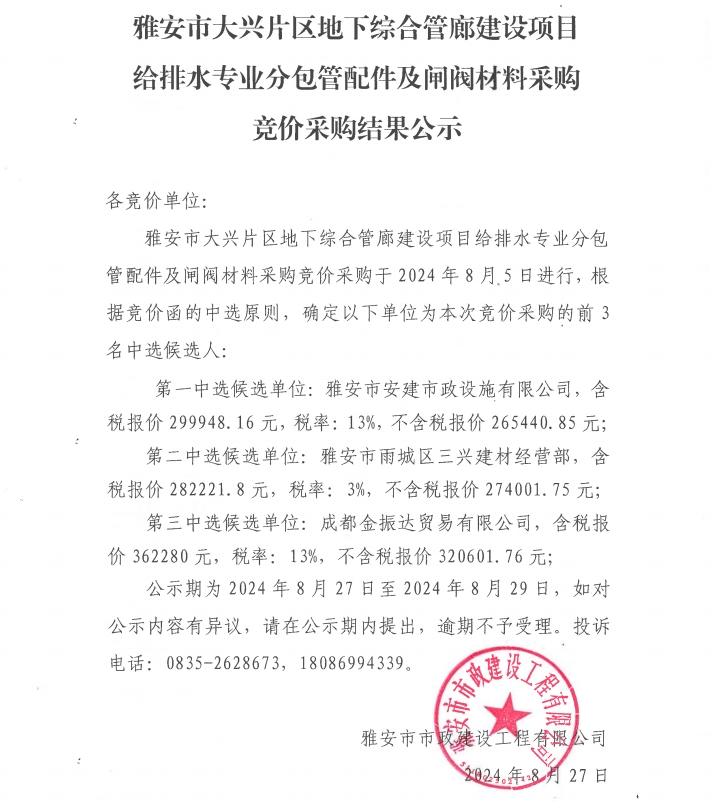 雅安市大興片區(qū)地下綜合管廊建設(shè)項(xiàng)目給排水專業(yè)分包管配件及閘閥材料采購(gòu)結(jié)果公示