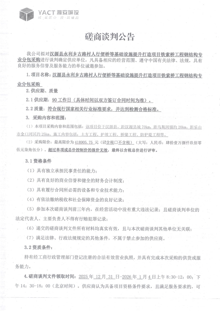 漢源縣永利古路村人行便橋等基礎(chǔ)設(shè)施提升打造項目鐵索橋工程鋼結(jié)構(gòu)專業(yè)分包采購磋商談判公告