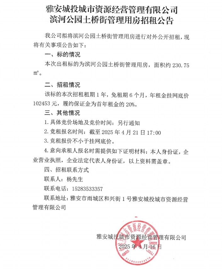 雅安城投城市資源經(jīng)營(yíng)管理有限公司濱河公園土橋街管理用房招租公告