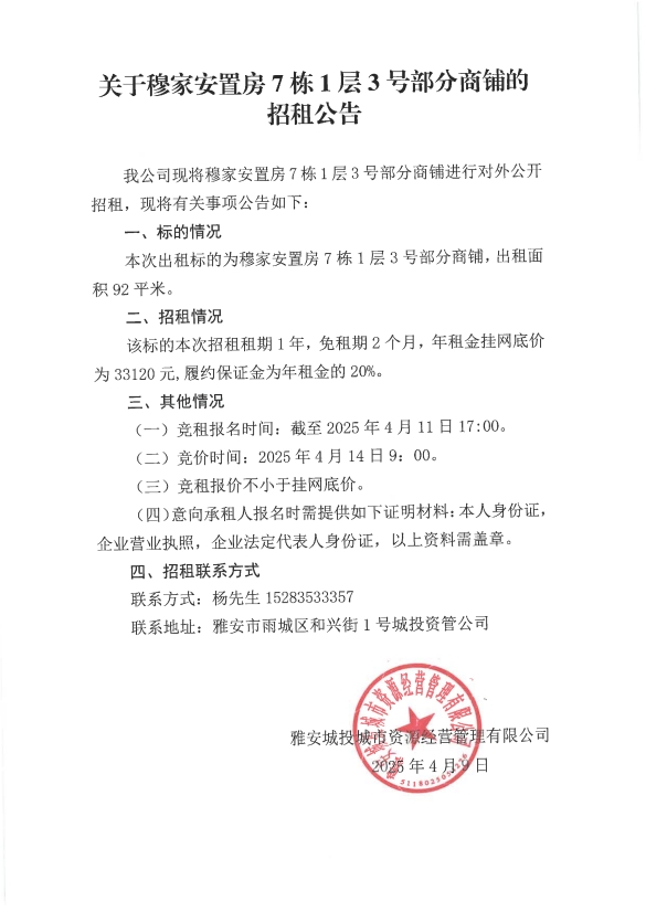 關(guān)于穆家安置房7棟1層3號部分商鋪的招租公告