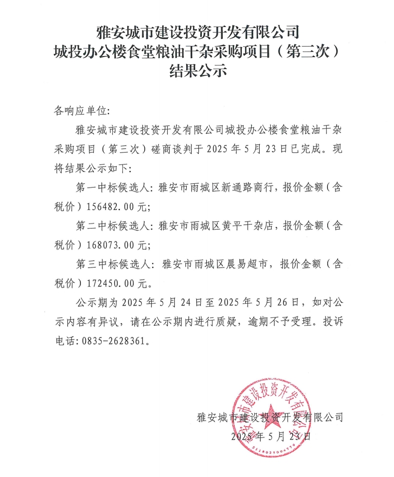 雅安城市建設(shè)投資開發(fā)有限公司城投辦公樓食堂糧油干雜采購項(xiàng)目(第三次)結(jié)果公示
