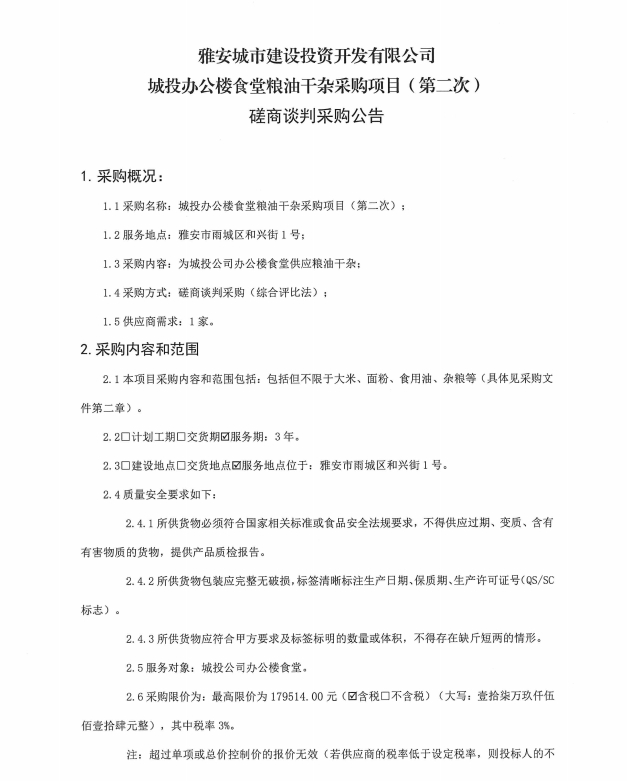 雅安城市建設(shè)投資開發(fā)有限公司辦公樓食堂干雜采購項目(第二次)磋商談判采購公告