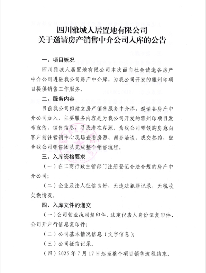 四川雅城人居置地有限公司關(guān)于邀請(qǐng)房產(chǎn)銷售中介公司入庫的公告