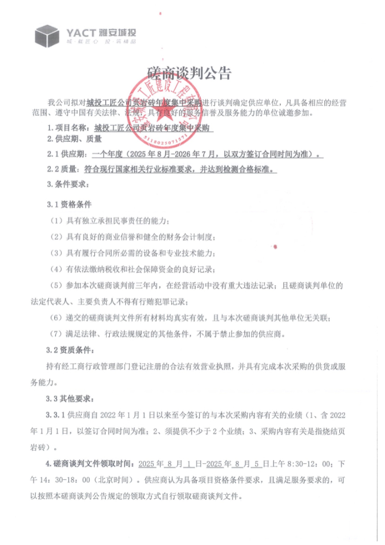 城投工匠公司頁巖磚年度集中采購磋商談判公告