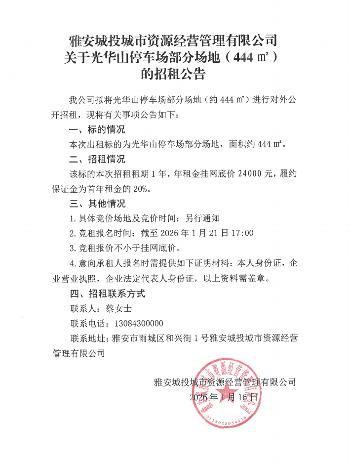 雅安城投城市資源經(jīng)營管理有限公司關(guān)于光華山停車場部分場地(444㎡)的招租公告