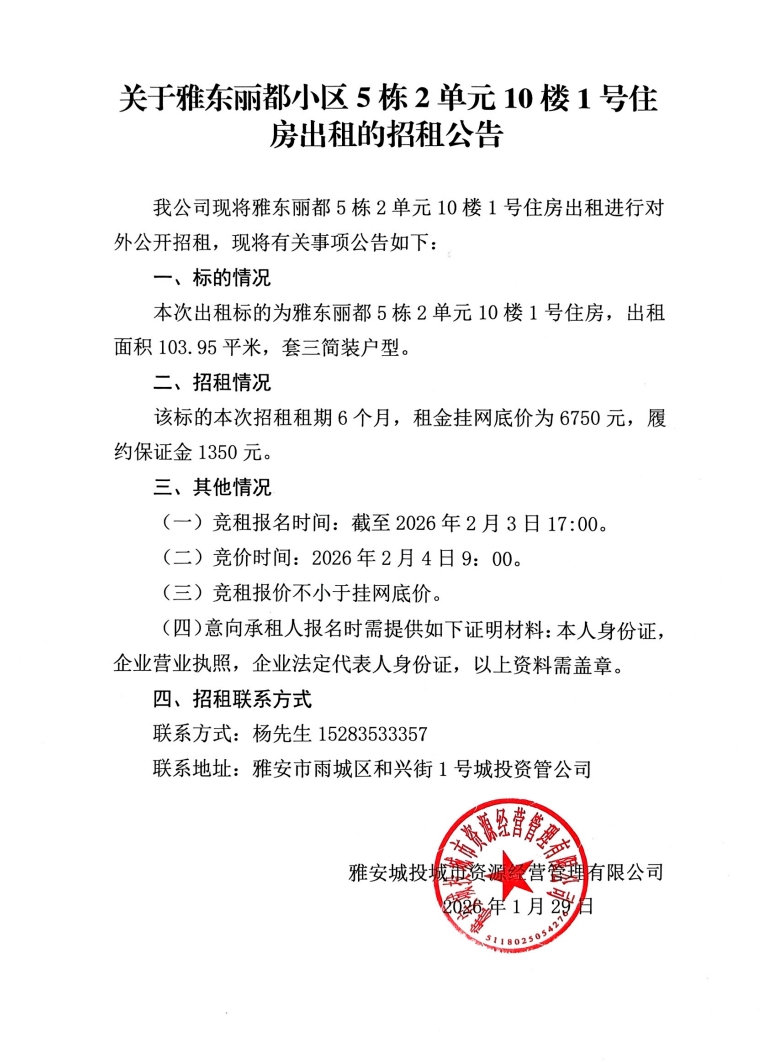 關(guān)于雅東麗都小區(qū)5棟2單元10樓1號住房出租的招租公告
