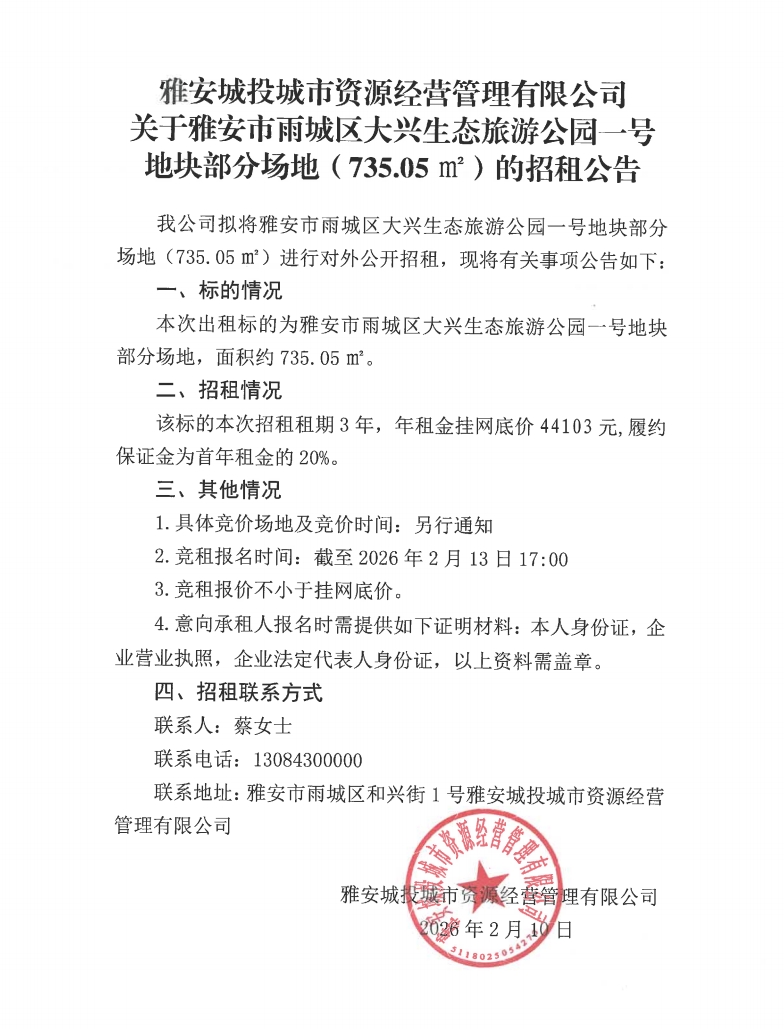 雅安城投城市資源經(jīng)營(yíng)管理有限公司關(guān)于雅安市雨城區(qū)大興生態(tài)旅游公園一號(hào)地塊部分場(chǎng)地(735.05㎡)的招租公告
