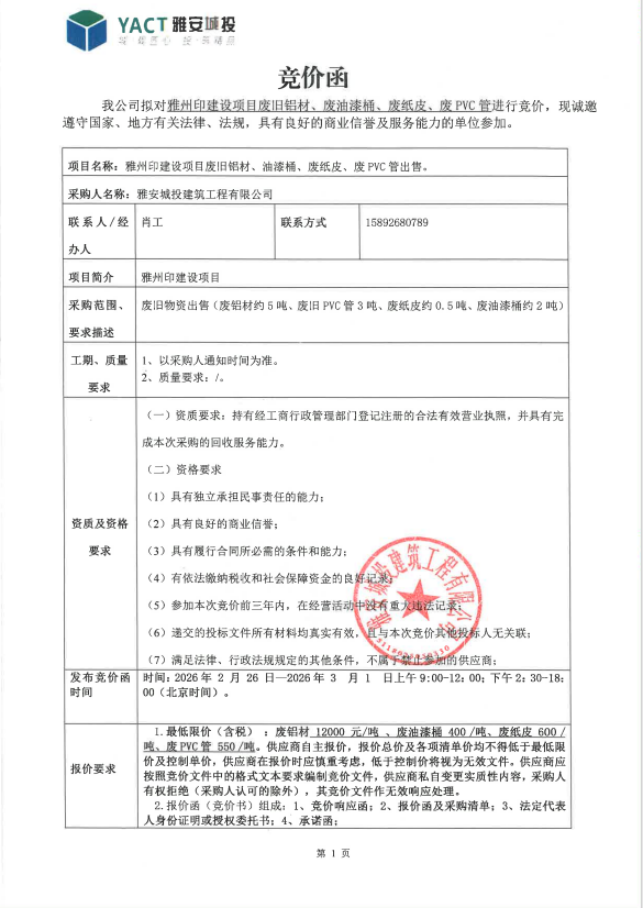 雅州印建設項目廢舊鋁材、油漆桶、廢紙皮、廢PVC管出售