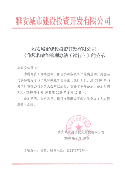 雅安城市建設(shè)投資開發(fā)有限公司《作風(fēng)和效能管理辦法(試行)》的公示