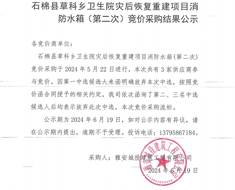 石棉縣草科鄉(xiāng)衛(wèi)生院災后恢復重建項目消防水箱(第二次)競價采購結果公示